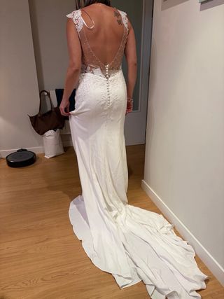 Vestido de novia elegante, sin estrenar y sin arreglos. Marca Nathaly Novia - Diseño con encaje y pedrería. - Corte sirena con cola. - Escote pronunciado en V. - Tirantes de encaje.