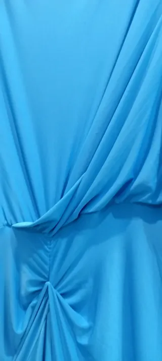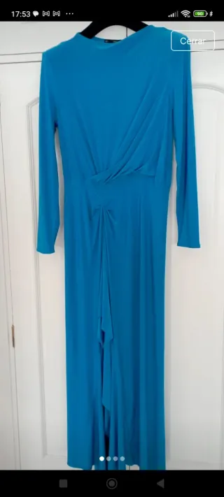 Vestido largo de color azul, sin estrenar. Ideal para boda o comunión . Tiene una abertura en la parte de delante , cuello caja , pequeñas hombreras y manga larga . Se adapta fenomenal al cuerpo. - Diseño con drapeado. - Detalle de nudo en la cintura. - Manga larga.
