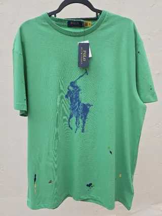 Camiseta de manga corta de hombre talla L original de la marca Polo Ralph Lauren. Está nueva con etiquetas sin estrenar. Es verde con el logo en el centro y detalles simulando motes de pintura, moderna y original. Le invito a hacer un lote con otras prendas de mi armario Acepto ofertas razonables! Hago envíos o entrego en mano