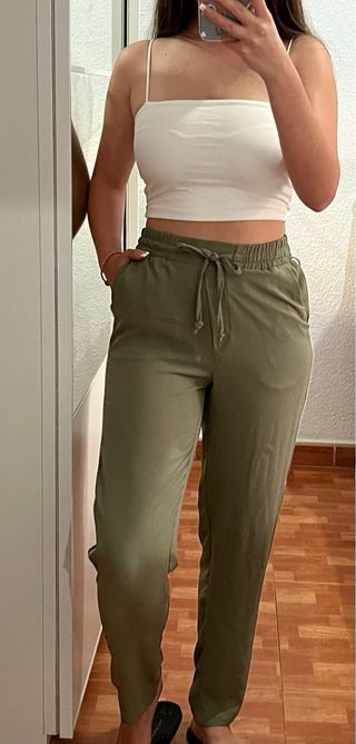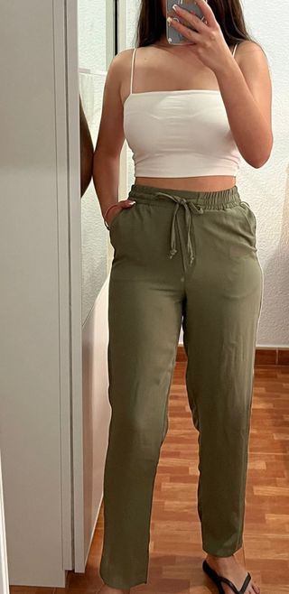 Pantalón largo verde. Tela suelta y finita. Tiene una fina línea blanca en la costura de cada lateral. Marca: Pimkie. Talla XS. Sin estrenar