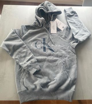 Sudadera CK Jeans original, nueva sin estrenar, color gris, talla XS pero vale tb para una S(medidas ver últimas fotos). - Logo de Calvin Klein Jeans estampado en el pecho. - Puños y bajo acanalados.