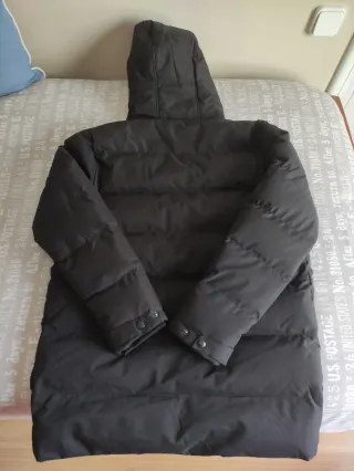 Parka de la marca Álvaro Moreno en color negro. Está completamente nueva, sin estrenar. Es una prenda de abrigo con capucha. - Cierre de cremallera. - Bolsillos frontales. - Puños ajustados. Parka acolchada con cuello subido y gorro. Cierre central mediante cremallera oculta por tapeta de botones a presión, cuatro bolsillos en el frontal y puños ajustables. Detalle personalizado en una de sus mangas. Corte regular fit. Composición y cuidados TEJIDO EXTERIOR: 100% poliéster FORRO: 100% poliéster RELLENO: 100% poliéster Admite limpieza en seco No usar lejía Planchar máximo 110º No lavar Admite uso de secadora