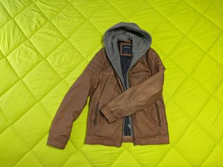 Chaqueta de la marca Springfield, de material similar al cuero, con un diseño moderno. Muy cómoda, con capucha que se puede poner o quitar. Tengo una igual sin estrenar en mi perfil. - Color marrón con detalles en gris. - Talla S (aunque es más bien una M) - Capucha opcional. - Cierre de cremallera. - Bolsillos frontales con cremallera.