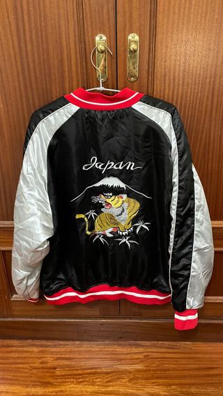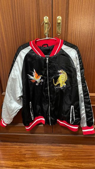 Chaqueta estilo bomber vintage con un diseño llamativo. - Mangas plateadas. - Cuerpo principal negro. - Cuello y puños con detalles en rojo y blanco. - Bordados de ave y tigre en el frontal.
