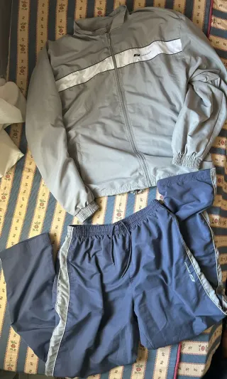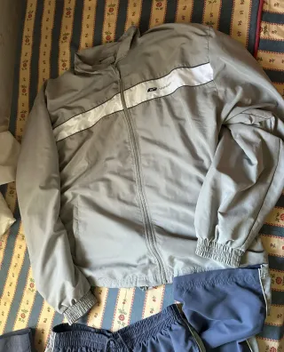Conjunto deportivo vintage de dos piezas. - Chaqueta gris con detalles blancos. - Pantalón azul marino con detalles grises.