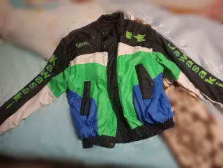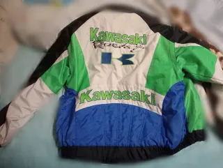 Chaqueta de estilo vintage con un diseño llamativo y deportivo. - Logo de Kawasaki Racing en la parte frontal. - Diseño de bloques de color en verde, blanco y azul. - Inscripción Kawasaki en las mangas.