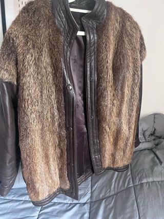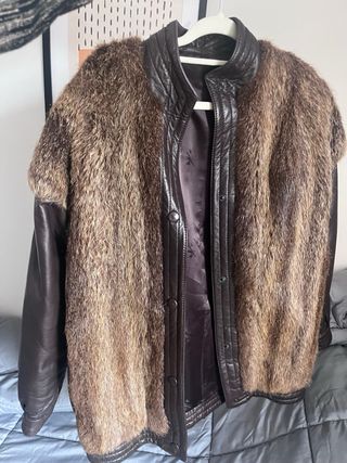 Chaqueta de cuero con detalles de pelo, posiblemente de bisonte. Da para L o XL (estilo oversized) - Material exterior: cuero y pelo. - Color: marrón. Hay un defecto pequeño, vease la ultima foto