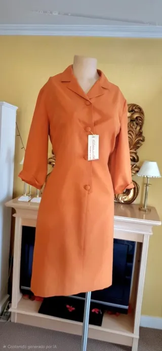 Elegante vestido en color naranja caldera con un diseño de corte clásico y atemporal. Destaca por su cuello de solapa y una fila frontal de botones forrados en el mismo tejido. Las mangas francesa un largo al codo muy favorecedor y el corte entallado ofrece una silueta muy limpia y profesional.Este vestido es una auténtica pieza vintage que destaca por tener un diseño totalmente actual que nunca pasa de moda. Su corte clásico y su estructura están tan vigentes hoy como el primer día, lo que lo convierte en una inversión atemporal para tu armario. La etiqueta figura una talla 48, a tener en cuenta que el tallaje es pequeño equiv/42.