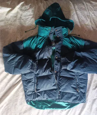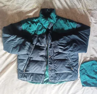 Antiguo abrigo y2k con capucha y mangas extraíbles (cremallera), bolsillos interiores y exteriores (cremallera), los puños de las mangas tiene las gomas pasadas y el color azul tiene el tono con desgaste por el tiempo pero apenas se nota. - Diseño bicolor en azul y verde. - Capucha ajustable con cordón extraíble - Cierre de cremallera y botones.