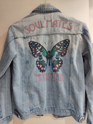 Cazadora vaquera estilo vintage de la marca Springfield. Un clásico renovado con detalles únicos. - Diseño desgastado y con rotos. - Parches decorativos de flores y colibrí. - Bordado WE ARE TOMORROW IN TODAY'S WORLD en la solapa. - Cierre de botones metálicos. - Bolsillos en el pecho.