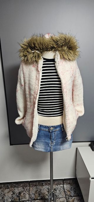 Cárdigan con capucha fija y un acogedor forro interior de borrego. - Diseño tejido con detalles en rosa. - Cierre de cremallera frontal. - Capucha con borde de pelo sintético.