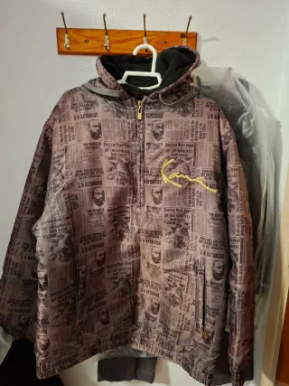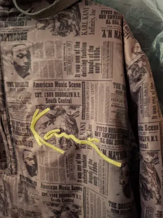 Chaqueta sudadera vintage de Karl Kani con un diseño único inspirado en periódicos sobre la vida de Karl Kani. Marca talla M americana pero parece una L-XL europea. Es de principios de los años 2000