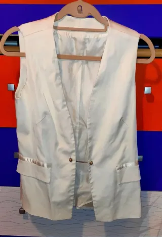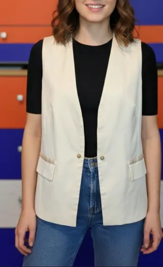 Elegante chaleco tipo sastre en color blanco crema o marfil, ideal para eventos, oficina o para elevar un look casual con vaqueros. Es una prenda con estructura y detalles de calidad. Detalles del diseño: Cierre frontal único: Cuenta con un cierre muy especial compuesto por dos botones unidos por una fina cadena, aportando un toque sofisticado y vintage. Bolsillos decorativos: Dispone de dos bolsillos laterales con solapa, adornados con una franja de cinta satinada al tono que le da un brillo sutil. Corte y ajuste: Cuello en "V" pronunciado y pinzas frontales que ayudan a entallar ligeramente la figura.