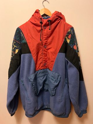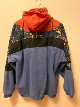 Polar ancho de estilo vintage y retro, con un diseño llamativo y colorido. - Tejido polar grueso y cálido. - Combinación de colores vibrantes. - Estilo deportivo y casual. -Con capucha y bolsillo frontal -Bolsillos laterales Tiene algunos signos notables de uso. 70cm de pecho
