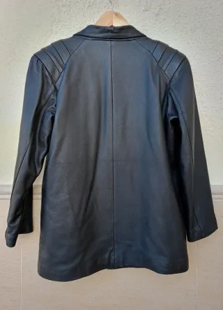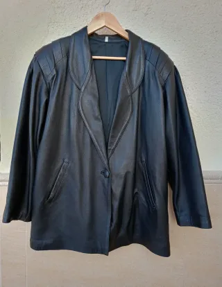 Chaqueta de mujer de cuero auténtico. Talla 46 (ver medidas en las fotos). Estilo oversize. Cuello de solapas. Cierre delantero con un botón, también forrado en piel. Con bolsillos. Forro interior en perfectas condiciones. Detalle de hombreras con pliegues. Vintage, original de los años 90. Muy cuidada. Leve roce en puños y en la espalda (ver dos últimas fotos). Está en muy buen estado.