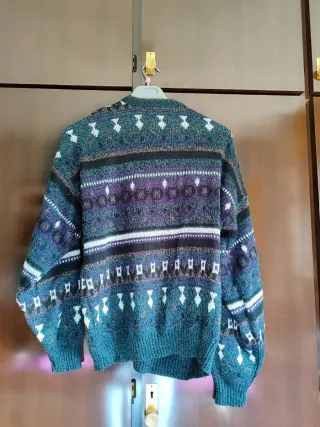Jersey de punto con un diseño geométrico y de rombos en tonos verdes y morados. Un clásico que aporta estilo. - Cuello en pico. - Manga larga. - Tejido de punto grueso.