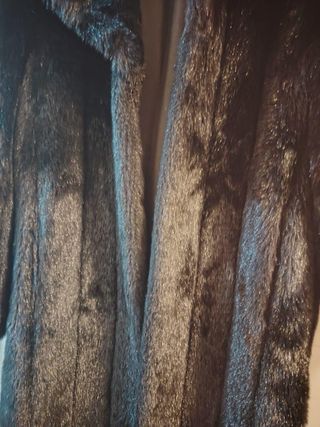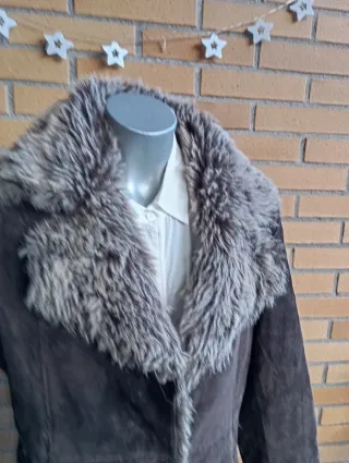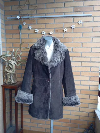 Abrigo de ante forrado con borreguillo. Se puede apreciar un pequeño picotazo en la axila y un descosido en la parte de atras de la manga. Ancho de hombros: 50cm Largo: 93cm Manga (desde el hombro): 65cm