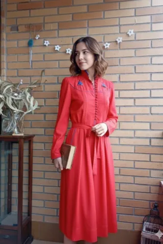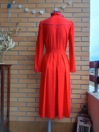 Vestido de estilo vintage en color rojo. Presenta un diseño con cuello mao y cierre de botones. - Mangas largas. - Cinturón a juego. - Detalle de bordado azul en el cuello.