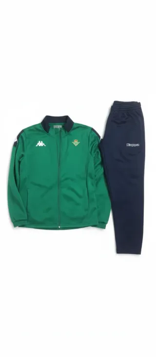 Conjunto de chándal completo del Betis, estilo vintage. - Tamaño de la sudadera y pantalón 14 años. - Chaqueta verde con detalles en azul marino. - Pantalón azul marino. - Logos de Kappa y escudo del Betis visibles.