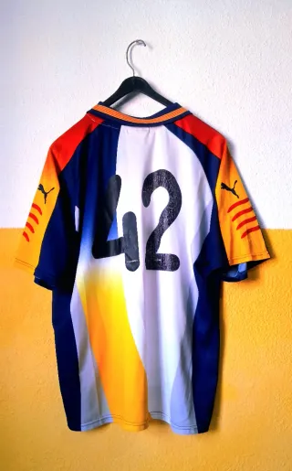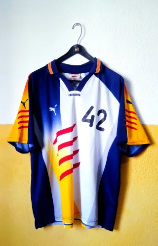 Camiseta de la Seleccion catalana de futbol de la temporada 2002/2003 vintage de la marca puma, tiene añadido un 42 de la marca kipsta en la espalda con desgaste visible y un dorsal 42 en la parte delantera (de ahi su precio). Talla L, buen estado. Barcelona barça Sevilla Levante Tenerife Betis Villarreal Rayo Vallecano Celta Vigo deportivo coruña Galicia racing santander oviedo ceuta melilla Madrid Atletico messi Cristiano francia nba baloncesto inter messi
