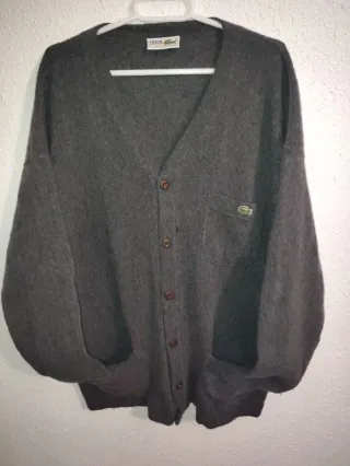 🧥 Chaleco / cárdigan Lacoste vintage – Made in Spain Chaleco cárdigan original Lacoste (Chemise Lacoste) en color gris oscuro. Modelo clásico con botones frontales originales Lacoste, bolsillos delanteros y el icónico cocodrilo bordado en el pecho. 📍 Fabricado en España, pieza vintage auténtica. 🧶 Tejido suave y calentito, ideal para entretiempo o para llevar sobre camisa o camiseta. 👕 Corte clásico, muy fácil de combinar (look casual o más arreglado). 📏 Talla: indicada como 7 (equivale aprox. a XL/XXL, recomiendo revisar medidas). 📦 Estado: buen estado ✨ Una prenda atemporal, perfecta si te gusta el estilo clásico-