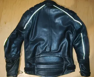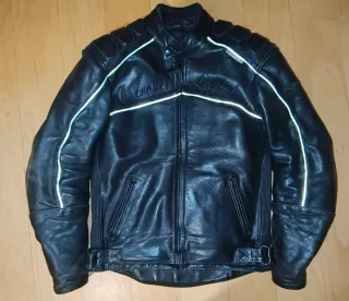 Chaqueta de cuero estilo vintage, ideal para motociclistas o para un look urbano. - Diseño clásico con detalles reflectantes. - Cuello alto con cierre de botón. - Cremallera frontal. - Bolsillos con cremallera en la parte delantera. - Cintura ajustable con hebillas. Precio algo negociable.