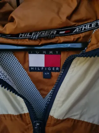 Cortavientos vintage de Tommy Hilfiger con un diseño de bloques de color. - Mangas de color naranja con logo. - Paneles de color crema y azul marino. - Cuello alto con cremallera.