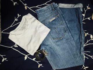 Vaqueros estilo vintage de los años 90 hechos en España. - Corte clásico. - Lavado azul. - Detalle de bolsillo trasero con logo. - Tiene dos manchas que no se han ido y que enseño en las fotos. -Solo se venden los vaqueros.