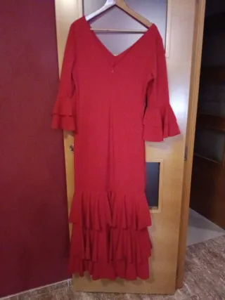 Vestido de flamenca con un diseño elegante y llamativo. Cremallera en la parte trasera - Mangas acampanadas con volantes. - Falda con varios niveles de volantes. - Escote en pico.