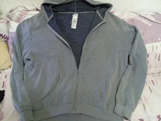 Sudadera con capucha de color gris. Es una prenda cómoda y versátil. - Cierre de cremallera. - Bolsillos delanteros. - Capucha ajustable con cordón.