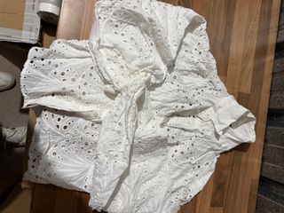 Blusa blanca de manga larga con detalles de encaje y bordados. - Escote en pico con puntilla. - Cierre de botones en la parte superior. - Tejido ligero con pequeños topos. - Corte babydoll.