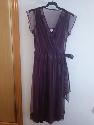 Precioso vestido midi de la marca Yokana, talla XL (aunque talla pequeño). Es de color morado y tiene un diseño elegante y femenino. - Vestido de tul con bordados florales. - Cierre de lazo en la cintura. - Mangas cortas. - Perfecto para ocasiones especiales.