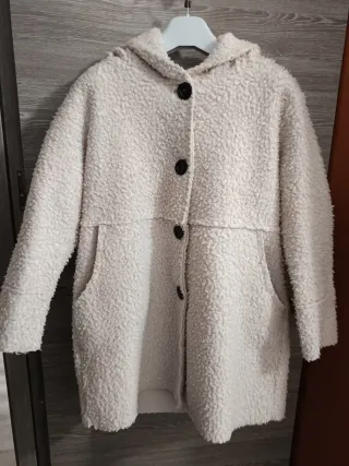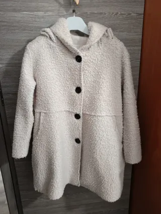 Abrigo blanco de borreguillo con un diseño moderno y cómodo. - Tejido suave y cálido. - Cierre de botones. - Bolsillos laterales. - Capucha integrada. Usado pero en perfectas condiciones, no dudes en preguntar ☺️