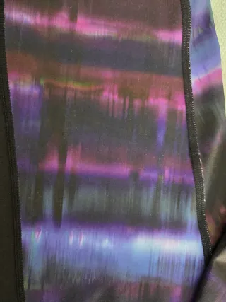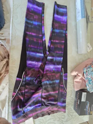 Leggings deportivos con un llamativo estampado en tonos morados y azules. Perfectos para tus entrenamientos. - Diseño con paneles laterales en negro. - Cintura elástica para un ajuste cómodo. - Detalle de ribete blanco en los bolsillos.