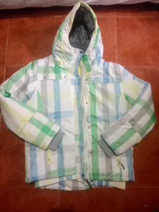 Chaqueta Joluvi con estampado a cuadros en tonos verdes, azules y amarillos sobre fondo blanco. Diseño moderno y funcional. - Capucha integrada. - Cierre de cremallera. - Puños elásticos.