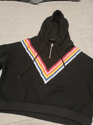 Sudadera negra con un diseño de rayas en forma de V en el pecho. Talla XL (normalmente uso la M pero quería que quede tipo oversize), color negro, en perfecto estado. Queda anchita y por la cintura. - Cremallera frontal. - Capucha con cordones. - Puños y bajo elásticos.