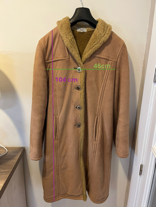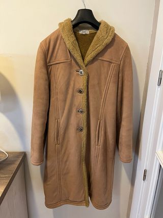 Abrigo largo de estilo vintage, perfecto para el frío. - Forro interior de pelo sintético. - Diseño elegante en tono camel. - Cierre de botones. - Bolsillos laterales.