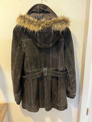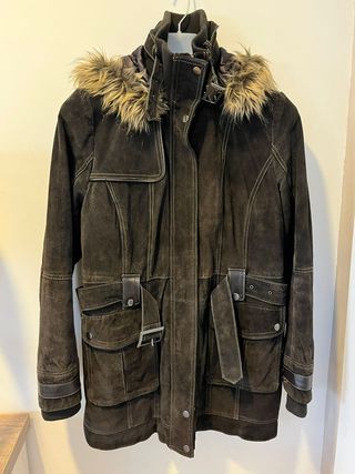 Abrigo de piel con capucha y detalles de pelo sintético. - Material: Piel - Color: Marrón - Diseño con múltiples bolsillos y cinturón ajustable.
