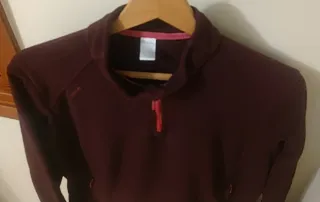 Forro polar de Decathlon en un bonito color berenjena. - Cierre de cremallera parcial en el cuello. - Bolsillos laterales con cremallera. - Puños y bajo elásticos. forro polar de senderismo, Quechua (marca de Decathlon). Características Principales Aislamiento Térmico: Fabricado con tejido polar cepillado por dentro y por fuera (200 g/m²), atrapa el aire para retener el calor corporal. Transpirabilidad: El tejido de punto de poliéster permite que el vapor de agua del cuerpo (sudor) pase a través, manteniéndote seco durante la actividad. Cuenta con media cremallera para ventilación y un cuello alto para mayor calidez. Con bolsillo
