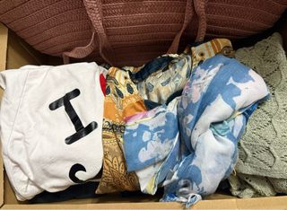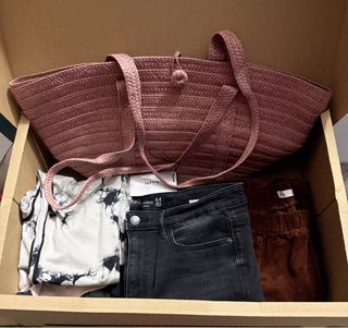 Caja con varias prendas de ropa de algunas tiendas conocidas como lesfties,Zara, Stradivarius,Sfera - Pantalones - Pañuelo estampado azul y amarillo. - Bolso de rafia rosa para playa nuevo sin ningun uso con su etiqueta - sudadera -bluson playa -mallas y regalo una chaqueta del zara tiene su uso pero esta todavia para seguir dandole uso