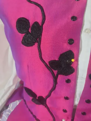 Corpiño para traje regional con un diseño llamativo. - Detalle de bordado negro. - Adornado con pequeños abalorios. - Diseño con escote curvo y puntas inferiores El color es bugambilla tal cual está en las fotos.Es una talla 42-44 hay medidas en las fotos