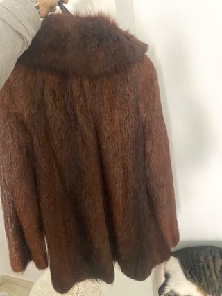 Abrigo de color marrón de polipiel con un diseño elegante y un cuello de pelo sintético. Esta completamente nuevo a estrenar, tiene las etiquetas. - el cuello de pelo es desmomtable - Cierre de botones. - Bolsillos frontales. - Puños ajustados.