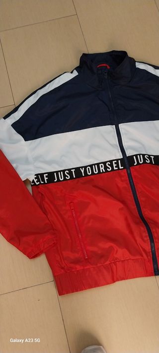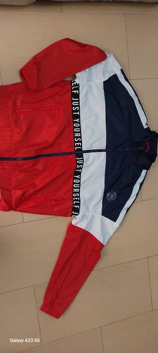 Chaqueta cortavientos con un diseño moderno y llamativo. - Paneles de color rojo, blanco y azul marino. - Banda lateral con texto JUST YOURSELF. - Cremallera frontal. - Bolsillos laterales con cremallera.