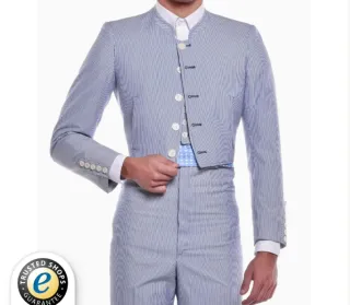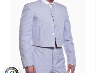 Chaqueta de traje corta con un diseño de rayas verticales. - Cuello mao. - Cierre de botones. - Puños con botones.