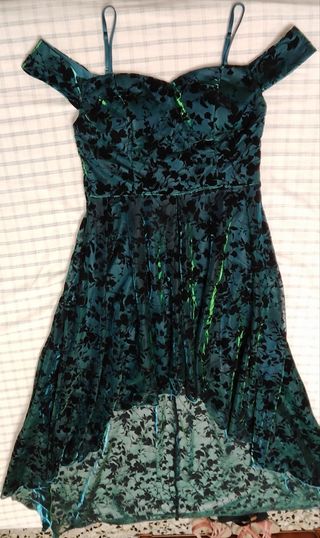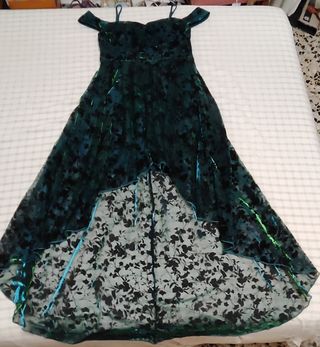 Vestido de fiesta con un diseño elegante y moderno, color verde oscuro y con flores aterciopeladas negras. Más corto delante y largo detrás. Cuerpo ajustado con relleno que realza el busto. Tiene cremallera trasera. Tirantas combinadas, las finitas son ajustables y las otras caen a su amor sobre los hombros. Talla XL, usado solo una vez durante poco tiempo quedando perfecto. - Tejido con estampado floral. - Corte asimétrico. - Tirantes finos y escote Bardot. Detalles y medidas en fotos. Se hacen envíos.