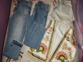 Conjunto de prendas de vestir para mujer. - Dos pares de jeans de corte recto. (1 par de usos) - Un pantalón vaquero acampanado talla 40/42 - Chaleco blanco con bordados florales y detalles étnicos.(Sin estrenar)