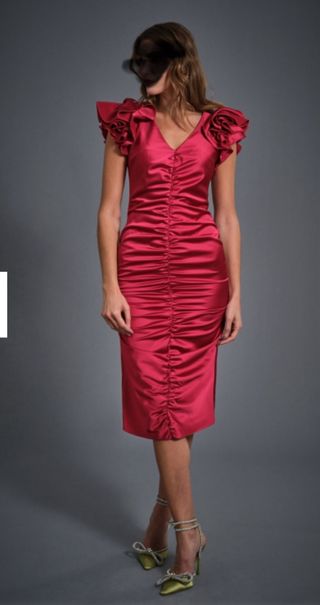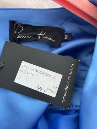 Precioso vestido de la marca Carmen Horneros, talla XL (42/14), nuevo con etiqueta. Es de color rosa y tiene un diseño elegante y favorecedor. - Escote asimétrico. - Detalle de volantes en la manga. - Falda midi.