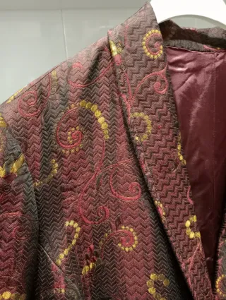 Elegante traje morado a rayas rojas. Nuevo. Incluye una corbata de regalo. - XL. 49 de ancho y 84 - Talla chaqueta 56 de pantalón 50. - Traje de dos piezas. - Diseño clásico a rayas. - Tejido de calidad, está impecable.