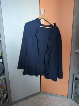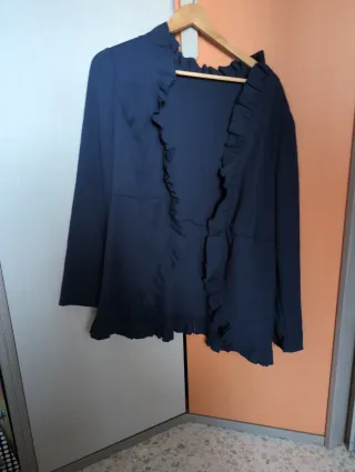 Elegante blazer azul marino con detalles de volantes. - Diseño con volantes en el cuello y el frente. - Manga larga. - Corte favorecedor.