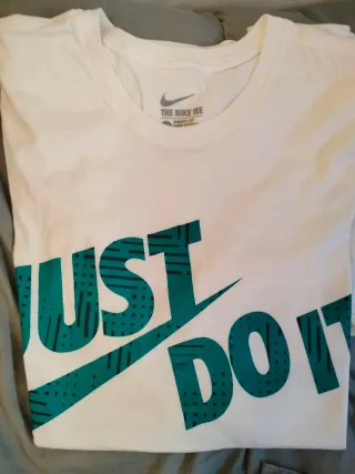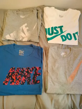 Lote de cuatro camisetas de la marca Nike. Incluye prendas en tallas XL y L. - Camiseta gris con logo grande blanco.L - Camiseta blanca con estampado Just Do It en verde.L - Camiseta azul con logo Nike en estampado rojo y negro.Xl - Camiseta gris con logo Swoosh naranja.L